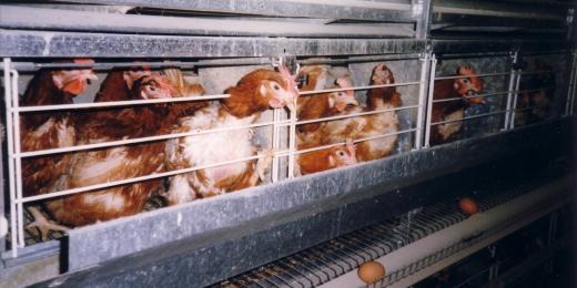 Staat voor kooieieren. Dit soort eieren worden niet langer verkocht in Belgische supermarkten. In een "verrijkte" kooi beschikt elke kip over een ruimte van amper een A4-blad groot (750 cm2), of 13 kippen per m2, met een (te lage) zitstok en een nest.