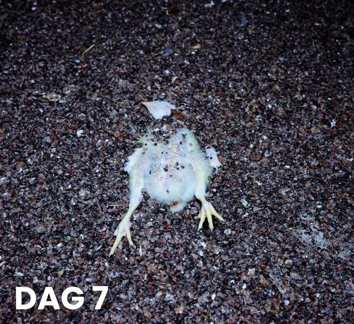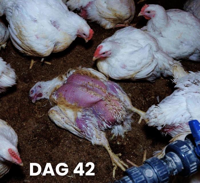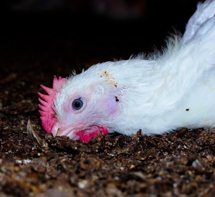 Onder deze schoen verwijzen verpletterde kippen naar het echte dierenleed achter elke Chicken McNugget.