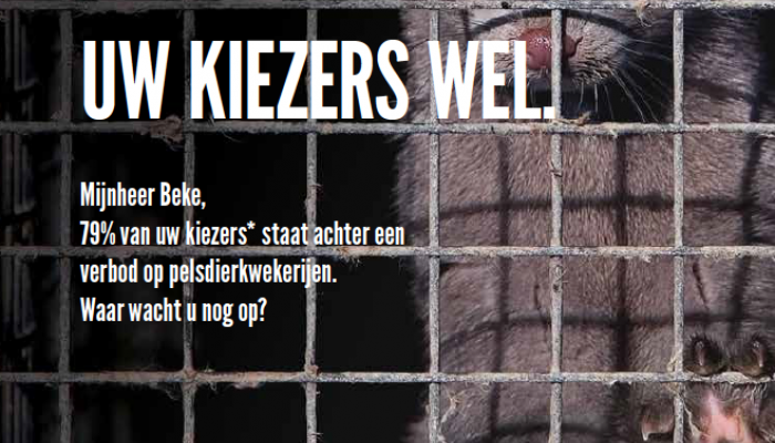 Is Wouter Beke doof? Doof voor de hulpkreten van 160 000 weerloze nertsen die in ons land in krappe kooien hun leven moeten slijten voor de bontindustrie? Doof voor de stem van zijn eigen achterban? Uit een opiniiepeiling van IPSOS blijkt immers dat 79% van de cd&v-kiezers gewonnen is voor een verbod op pelsdierkwekerijen.